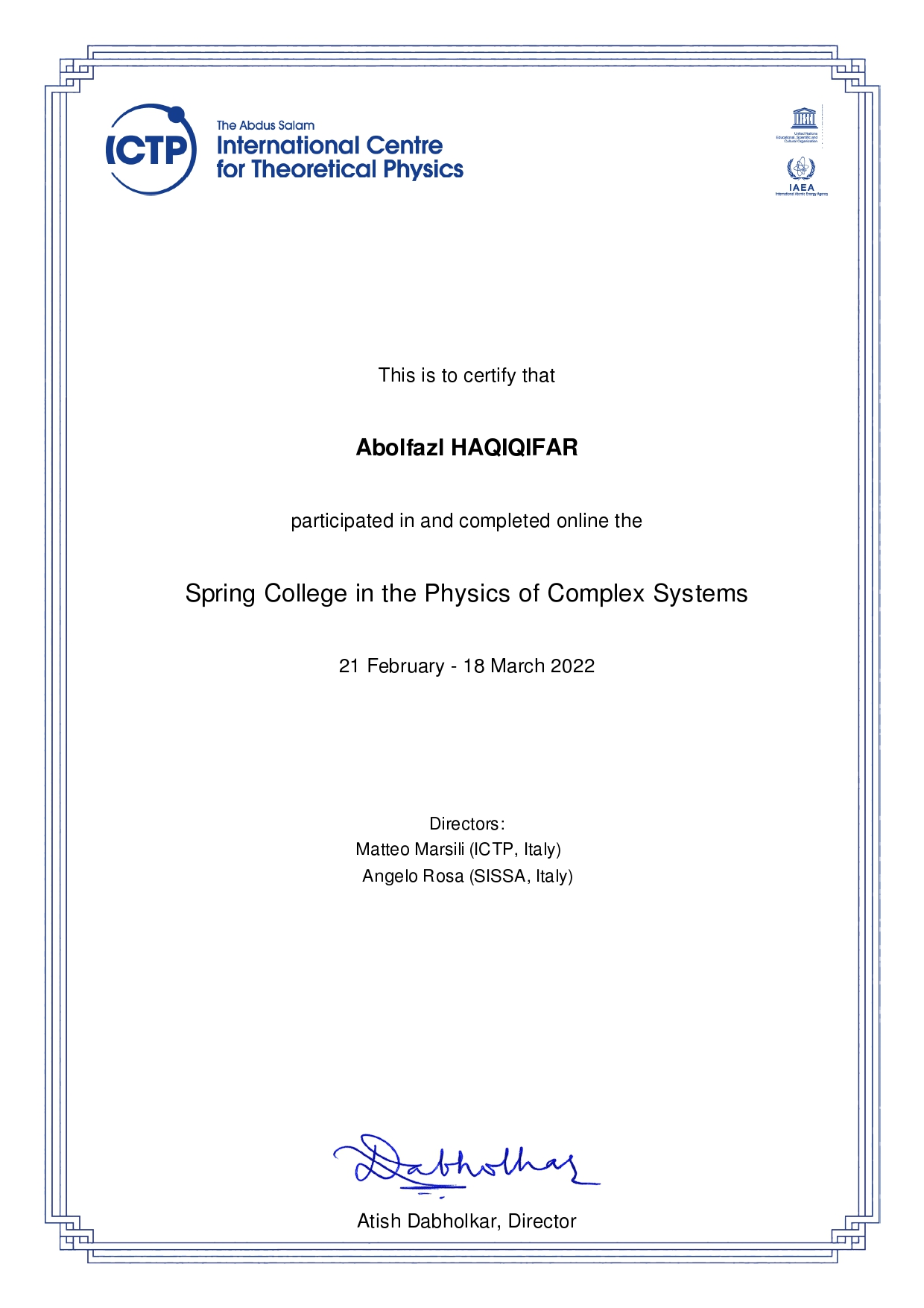 - Master’s degree in Statistical Physics and Complex Systems, Shahid Beheshti University